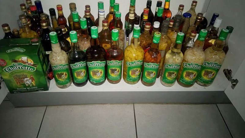 Quelques rhum arrangés péi avec des fruits passion, ananas, banane, lytchee, vanille .....de notre merveilleuse île, mais aussi avec des fruits de la métropole poire William , figue , abricot, pêche framboisé , fraise , mirabelle...... Et pleins d'autre à boire avec modération tout de même