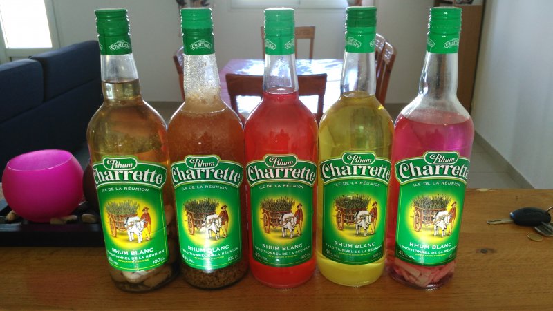 Vrai rhum arrangé charrette local, servi dans un bon verre charrette , bouteille au couleur local ile de le reunion fait main 😉